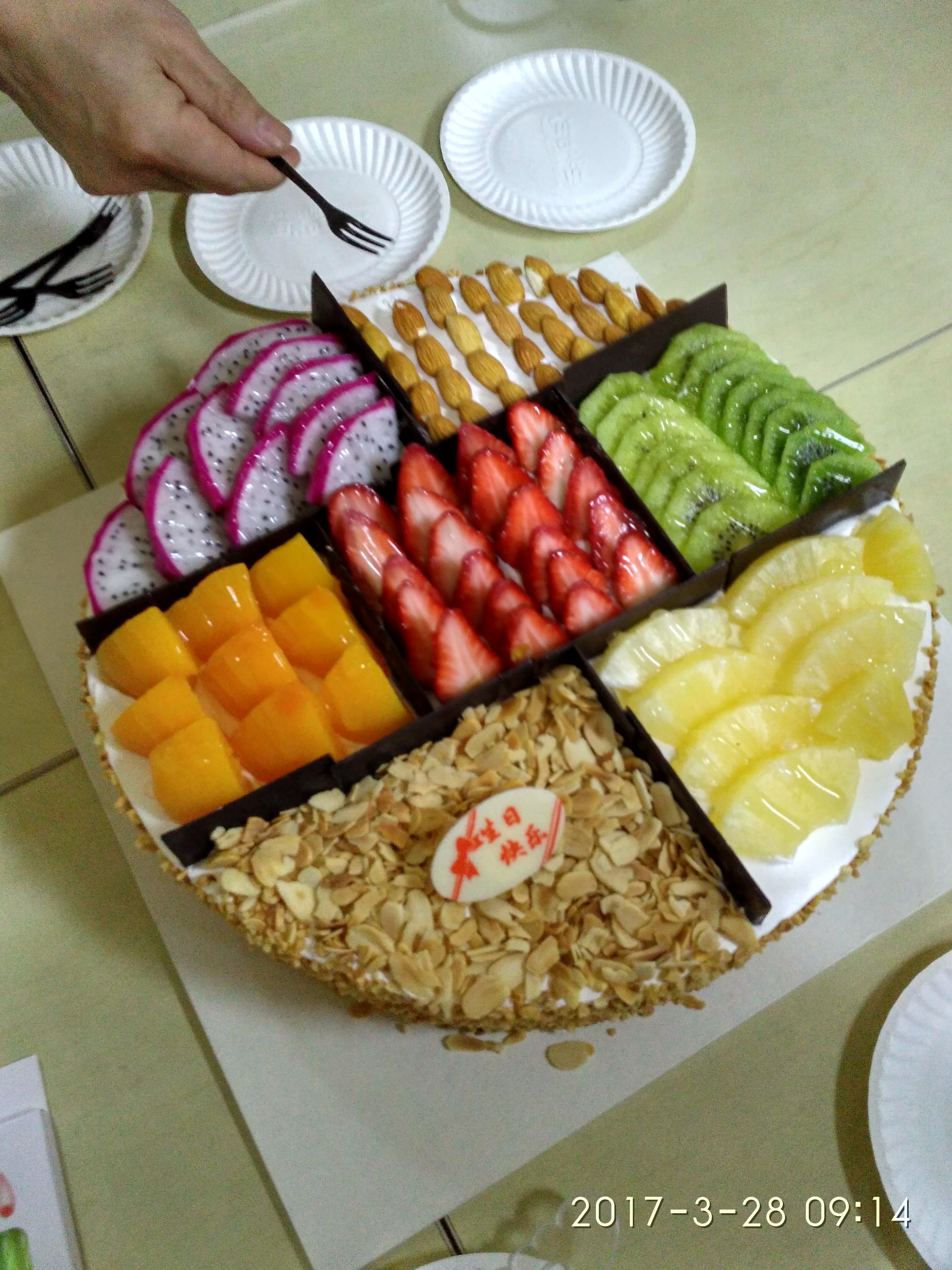 9點10分公司為本月過生日的3位家人慶祝生日快樂,分享美味的蛋糕。