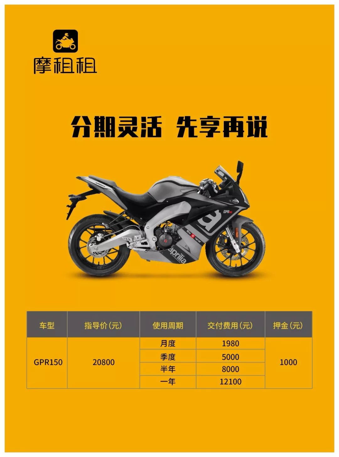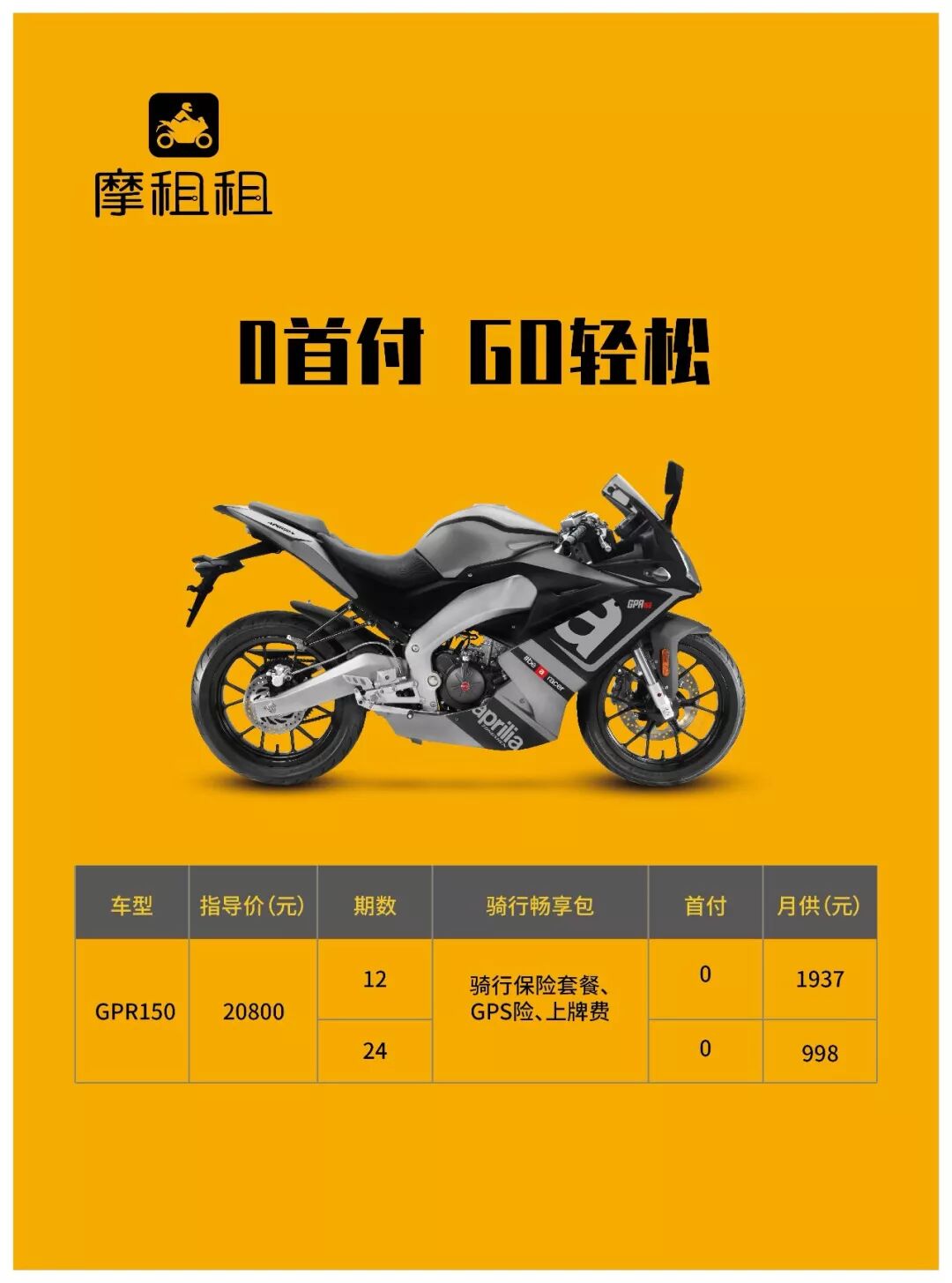 哪怕前路漫漫,依然氣定神閑的底蘊(yùn) 歷經(jīng)重重阻礙,也要擰到底的倔強(qiáng) 無論彎道超車還是直線飆車,依然帥炸了的霸氣 每一次的努力,不是為了隨波逐流,而是擁有更多選擇夢(mèng)想的權(quán)利,選擇有意義、豐富多彩的人生。 騎士們的果敢、個(gè)性和自由獨(dú)立,一直深深地打動(dòng)著小喬。 選擇夢(mèng)想的顏色,就像享用aprilia機(jī)車,是一道多選題。 PLAN A:O首付 GO輕松 LOCATION:濟(jì)南 成為當(dāng)?shù)貑逃丫銟凡繉贂?huì)員,享受會(huì)員增值服務(wù),GPR150,O首付,12/24期輕松月付,分期自由,上牌及保險(xiǎn)一起打包,尾款結(jié)清之后,車輛歸您所有。用前期更少的投入享受新型消費(fèi)的體驗(yàn)樂趣,你不單是勇敢的騎士,也是騎士中消費(fèi)潮流的風(fēng)向標(biāo)。 PLAN B:分期靈活 先享再說 LOCATION:成都 你想來個(gè)“蜜月”再看看合不合適的小心思,小喬都懂。成為當(dāng)?shù)貑逃丫銟凡繉贂?huì)員,享受會(huì)員增值服務(wù),GPR150, 月度/季度/半年/一年,四種期數(shù),靈活多變,給你任性的理由。即便短期享用,小喬也希望看到你用心呵護(hù)的帥氣模樣,與小喬溫柔相伴。 PS:現(xiàn)在推出的暫時(shí)只有GPR一款車型,數(shù)量有限,先到先享。 我知道,你已經(jīng)做好了接我回家的準(zhǔn)備。